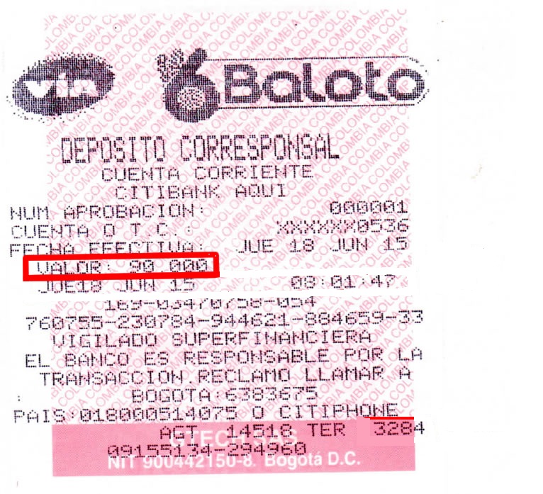 Para realizar una consignación por CitiBank, También puede hacerlo por puntos Baloto, debe consignar directamente en la caja sin necesidad de llenar formatos y asegurarse que la terminación del valor sea 0.000 (ej. 200.000, 250.000, 980.000) o el Código (Monto Final) (ej. 201.632, 251.632, 981.632) Asignado por la Plataforma, si usa la terminación 0.000, puede dar aviso de deposito reportando la imagen, si consigna usando el Código (Monto Final), esta ingresará automáticamente a su cuenta.